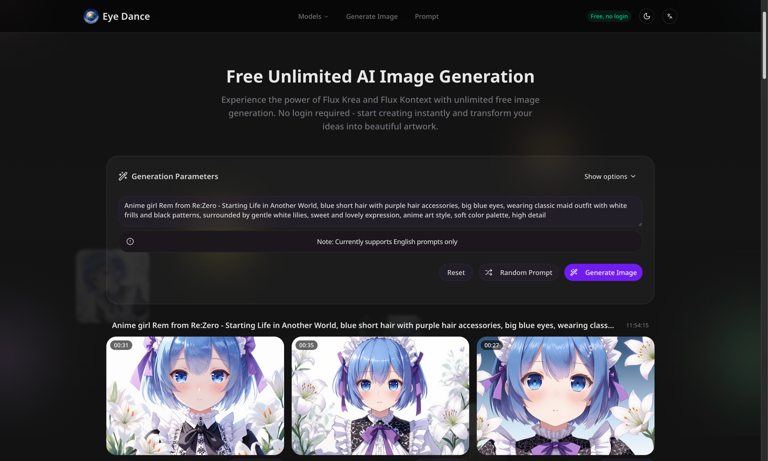 经过长期使用,也因为手上有几张闲着的显卡 (如果生图很慢,可能是因为我在打游戏),我开发了一个完全免费的 AI 图像生成平台——Eye Dance,它彻底解决了传统 AI 生图工具的问题:无需注册、无需付费、无需复杂设置,直接输入文字描述就能生成高质量图片。