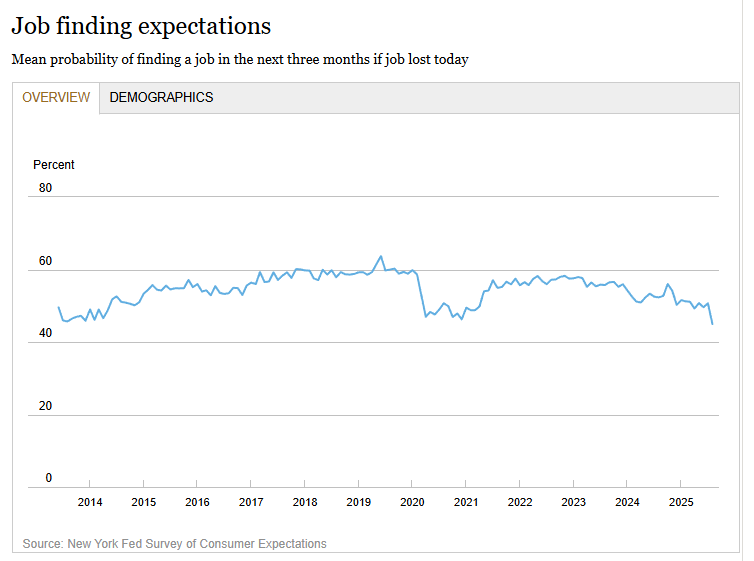 报告显示,「如果今天失业,未来三个月内能找到工作」 的平均概率环比骤降近 6 个百分点,降至自 2013 年纽约联储开始追踪该问题以来的最低水平,这也是自新冠以来最大环比跌幅。